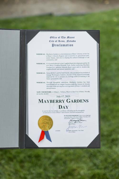 On a sunny summer afternoon in Reno, the grand reveal of Mayberry Gardens was made even more memorable with a special visit from the City of Reno’s Vice Mayor, Kathleen Taylor. Representing Mayor Hillary Schieve, Vice Mayor Taylor delivered a proclamation officially declaring July 17th as Mayberry Gardens Day—a tribute to the site’s rich history and its exciting new chapter.
